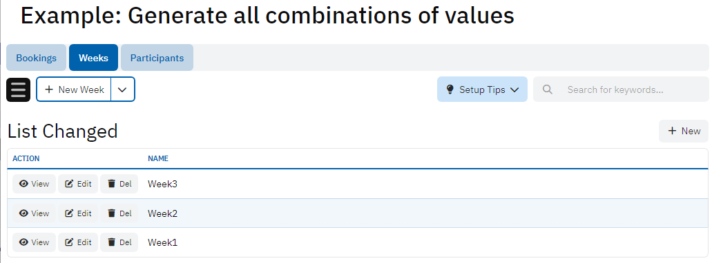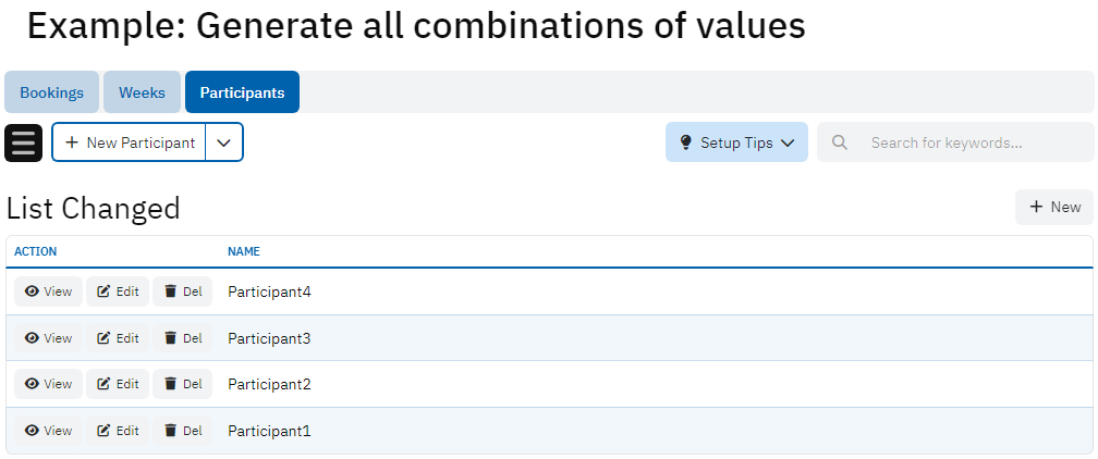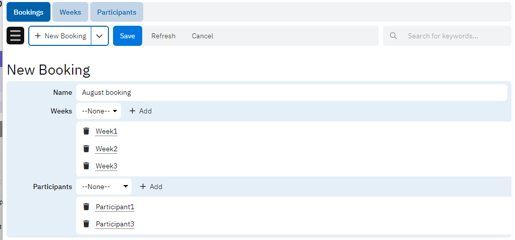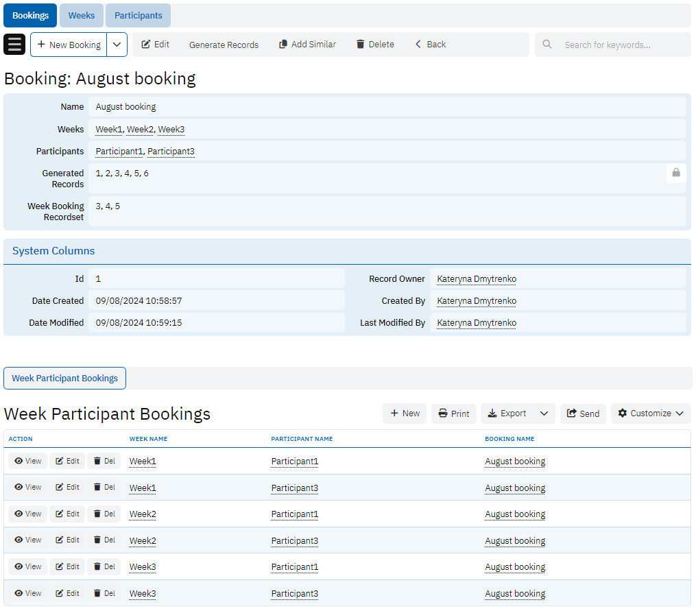 This example shows how to generate bookings for participants. Each participant could have bookings for several weeks. Instead of manually creating all the records, simply select the participants and the weeks so that all the bookings for each combination would be generated automatically.