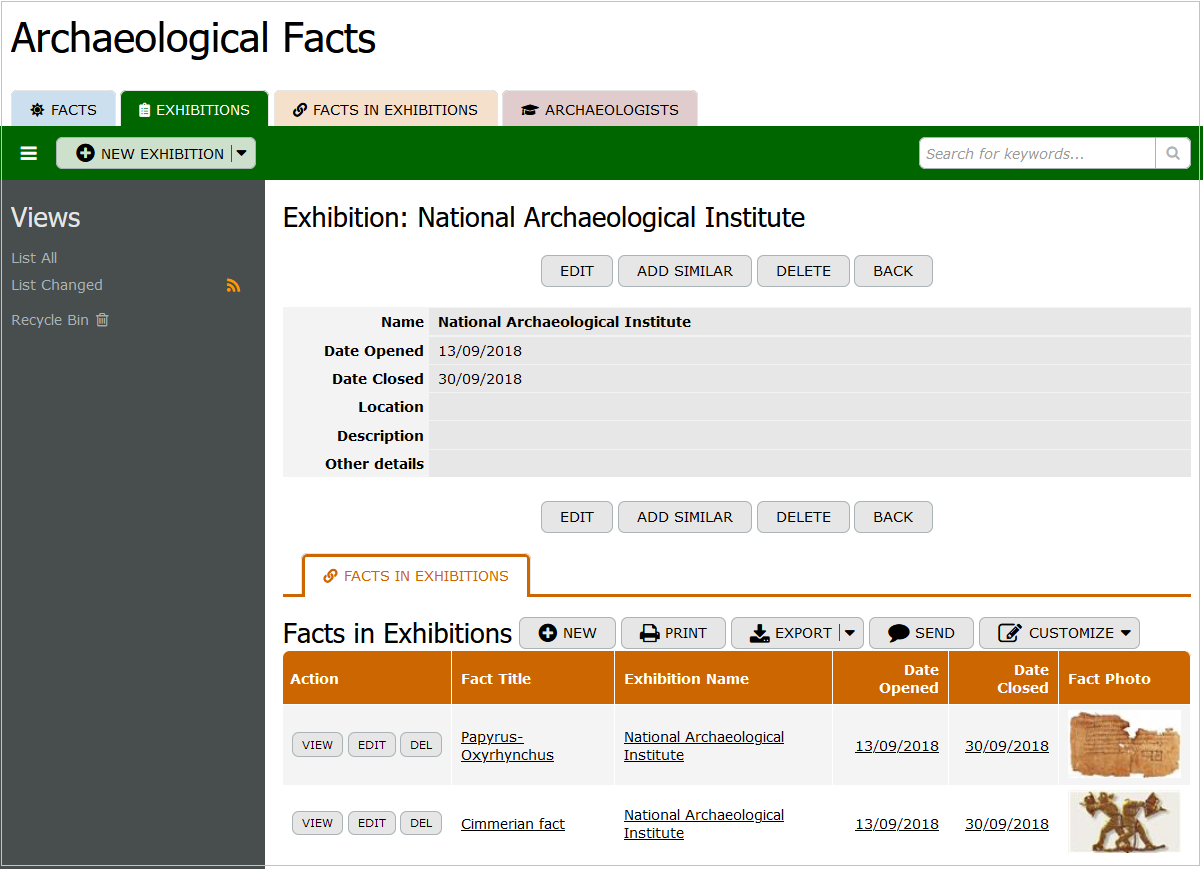 The "Facts in Exhibitions" table links archaeological facts to the exhibitions in which they are displayed. It includes the title of the fact, the name of the exhibition, the dates the exhibition opened and closed, and a photo of the fact. This table is crucial for tracking which facts were featured in which exhibitions, providing a clear history of how and where findings have been showcased.