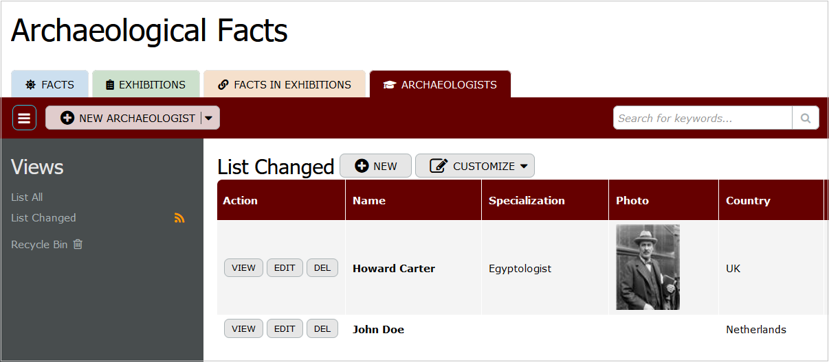 The "Archaeologists" table stores detailed information about the archaeologists involved in discovering and researching facts. It includes their full name, specialization, photo, country of origin, date of birth, and other relevant details. This table helps in maintaining a comprehensive record of the professionals contributing to the field of archaeology, facilitating recognition and collaboration within the community.