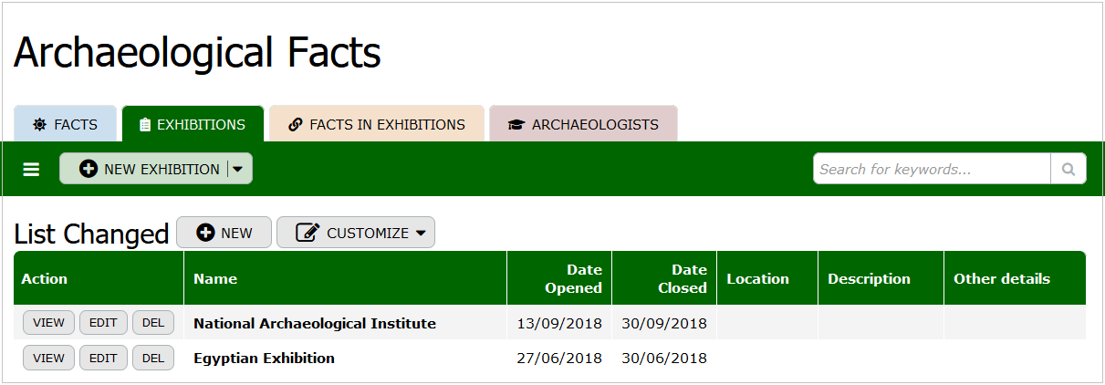 The "Exhibitions" table contains information about exhibitions where archaeological facts are displayed. It includes the exhibition's name, dates it opened and closed, location, and a description. This table helps in organizing and managing exhibitions, ensuring that each event is well-documented and the information is easily accessible for planning and historical record-keeping.