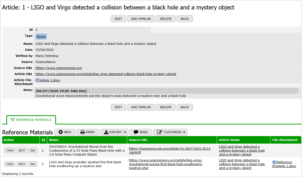 The Reference Materials table focuses on supplementary materials that support the articles. It includes information about the reference materials, such as the name, source URL, associated article name, and file attachments. This table helps in organizing and linking additional resources that complement the scientific articles, ensuring that all necessary reference materials are readily available for thorough research and study.