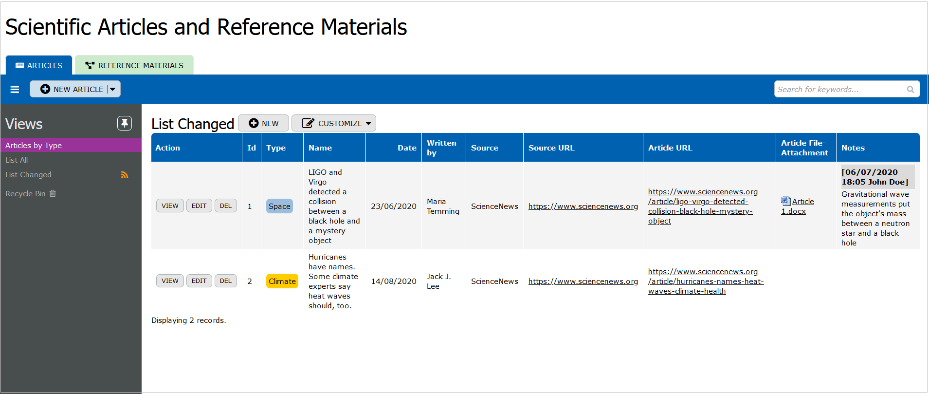 The Articles table serves as the core repository for scientific articles. It includes details such as the article's type, name, date of publication, authors, source, and URLs for both the source and the article itself. This table also stores file attachments for the articles and notes related to each entry. It is essential for tracking and managing the articles, making it easier for researchers to locate and review the documents relevant to their studies.