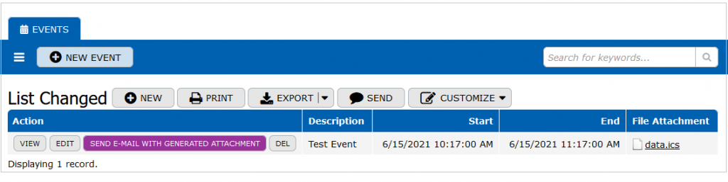 Now, if you need to send an e-mail alert allowing recipients to easily add an event to their calendar app, just click on the “Send E-mail with Generated Attachment” button.