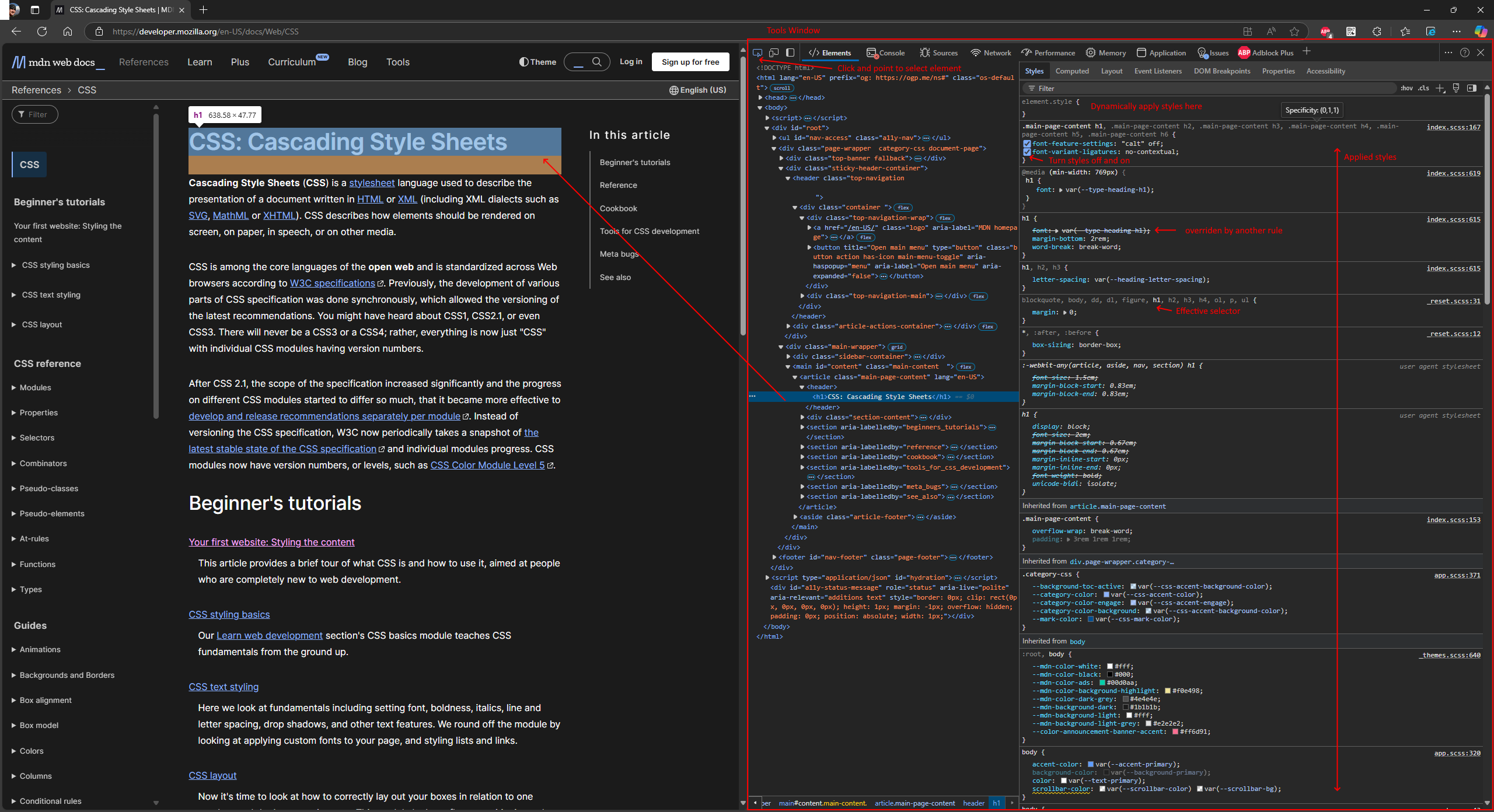 Styles tab lists rules to apply to the selected element, listed in the order of selector specificity. Moreover, it allows dynamic style modifications. You can turn individual declarations on and off, write your own styles and rules. Changes you make on the Styles tab immediately reflected on the page but obviously won’t be saved back to the source.
