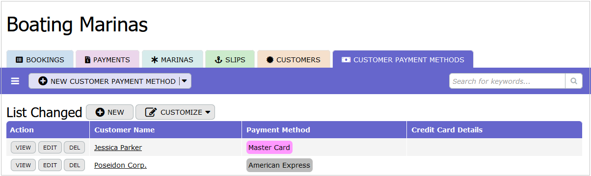 The "Customer Payment Methods" table keeps track of the payment methods used by customers. It includes customer names, payment methods, and credit card details. This table is essential for managing the financial information of customers, ensuring that payment methods are securely and accurately recorded.