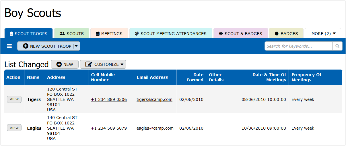 The "Scout Troops" table contains essential information about each Boy Scout troop. It includes the troop's name, address, contact details, date formed, meeting schedules, and other relevant details. This table helps manage troop-specific information, ensuring that troop leaders and members have a centralized repository for troop data.