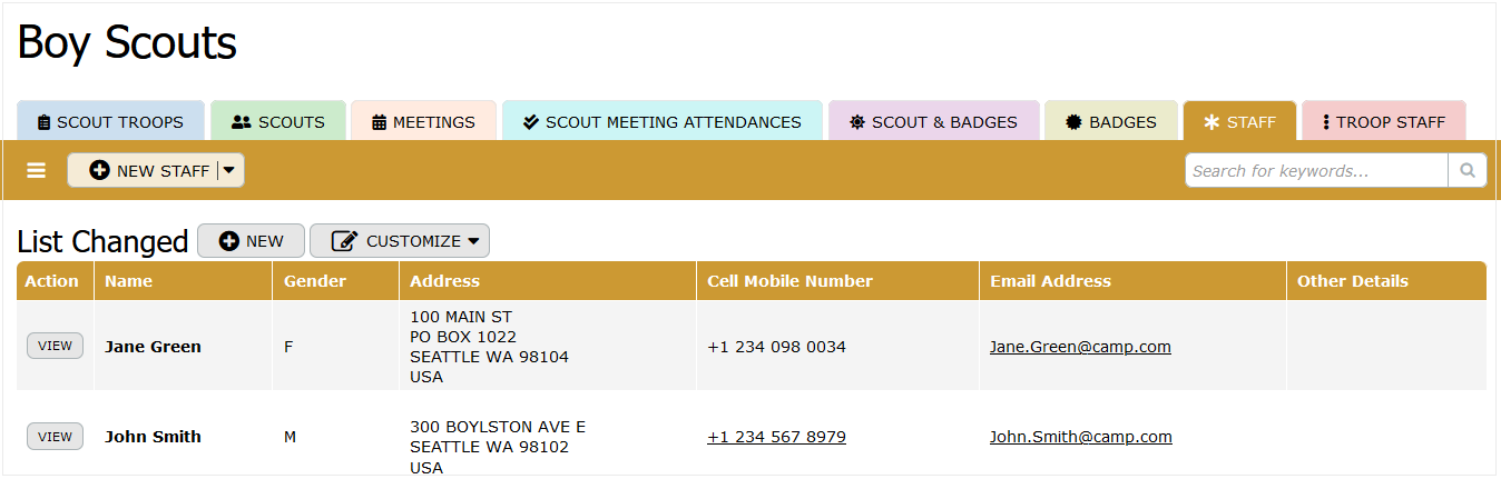 The "Staff" table stores information about the staff members involved in the Boy Scout troops. It includes staff names, contact details, and other relevant information. This table is essential for managing the personnel who support and lead the scouts, ensuring that troop leaders have access to staff data.
