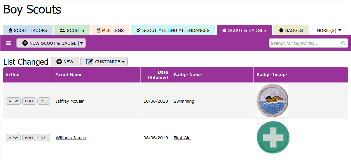 The "Scout & Badges" table records the badges obtained by scouts. It includes the scout's name, date the badge was obtained, and badge details. This table is crucial for recognizing and documenting the achievements and skills of individual scouts, encouraging their growth and development within the troop.