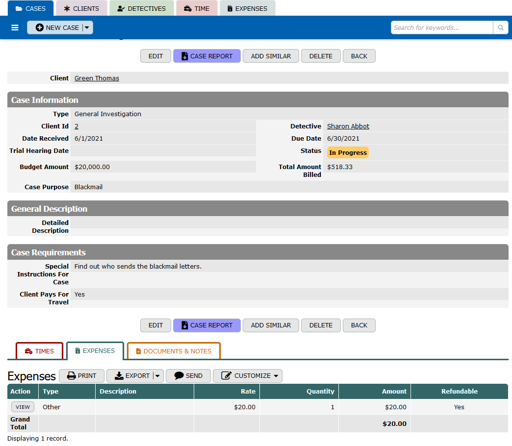 The "Expenses" table records financial transactions related to investigative cases. It includes expense IDs, associated Time IDs, expense types, descriptions, quantities, amounts, client and case affiliations, refundability status, and administrative details (record ownership, creation and modification dates). This table provides transparency in financial dealings and supports budget management throughout the investigative process.