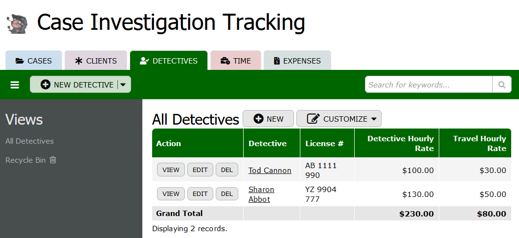 The "Detectives" table maintains records of detectives assigned to handle investigative cases. It includes detective IDs, licensing information, contact details (address, phone), hourly rates for detective work and travel, specialties, and administrative fields (record ownership, creation, and modification dates). This table facilitates the assignment of detectives based on their expertise and availability, ensuring appropriate handling of each case.