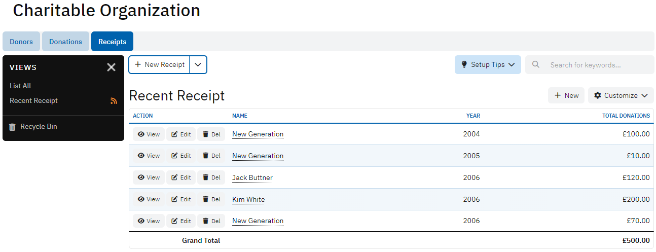 The Receipts table is used to generate receipts for donors, summarizing their total donations for a specific year. It includes donor information, total donation amount, receipt number, and other relevant details. This table ensures that donors receive proper acknowledgment for their contributions and can use the receipts for tax purposes.