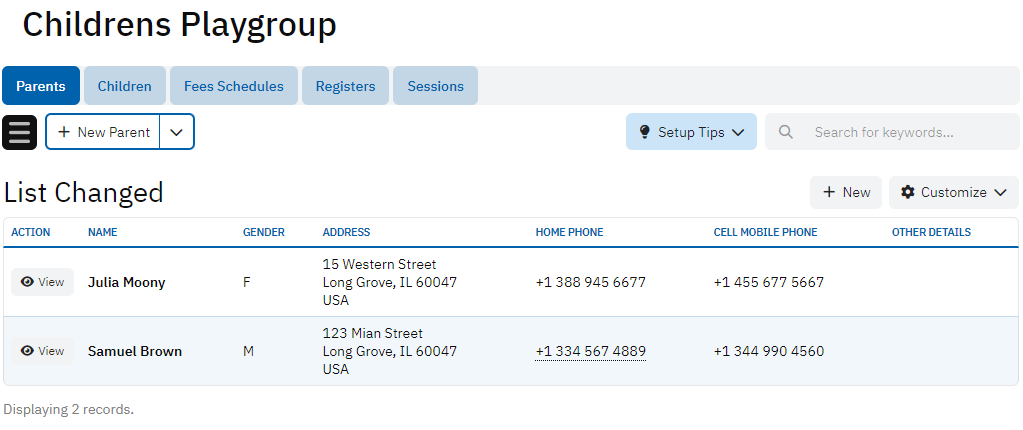 The Parents table stores information about the parents or guardians of the children attending the playgroup. It includes details such as name, gender, address, home phone, cell phone, and other relevant information. This table helps keep track of contact information and other essential details about the parents.