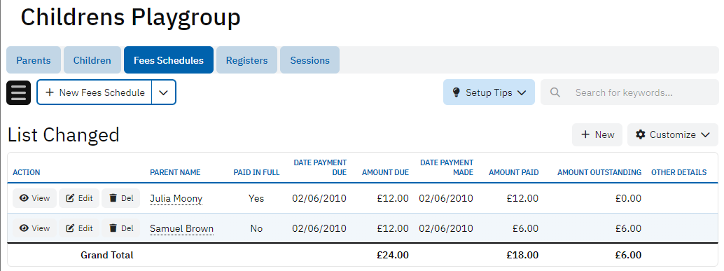 The Fees Schedules table tracks the payment details for each child. It includes the parent's name, payment status, due dates, amounts due, amounts paid, and any outstanding amounts. This table is crucial for managing the financial aspects of the playgroup, ensuring that payments are tracked and recorded accurately.