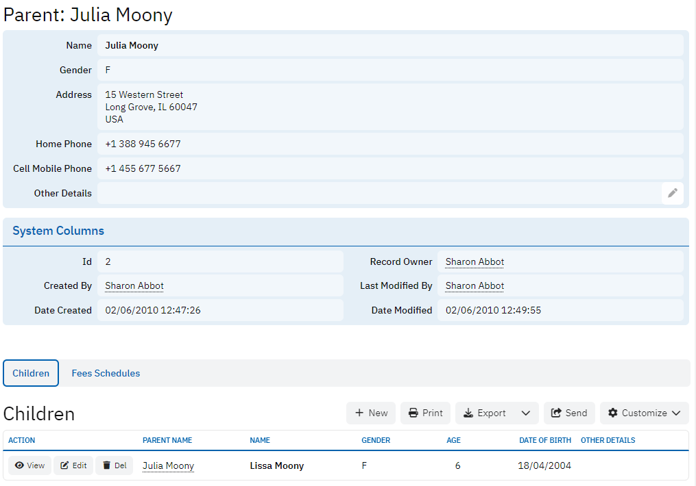 The Children table contains details about the children enrolled in the playgroup. It includes the child's name, first name, last name, gender, age, date of birth, and other relevant details. This table is linked to the parent information and helps in managing the children's data efficiently.