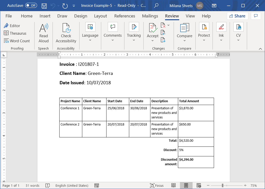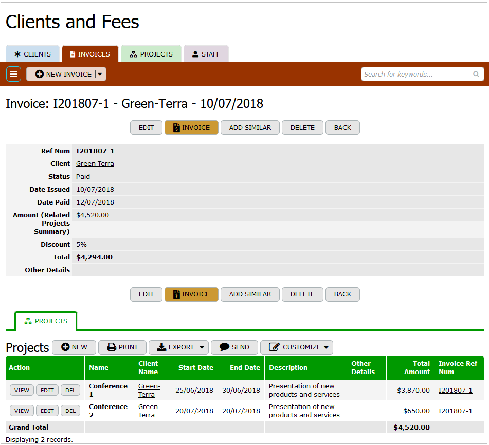 The "Invoices" table tracks information about invoices sent to clients, including a unique reference number, the status of the invoice (such as whether it has been paid or is overdue), the date it was issued, the date it was paid, any discounts applied, and other details that may be relevant to the invoice.
