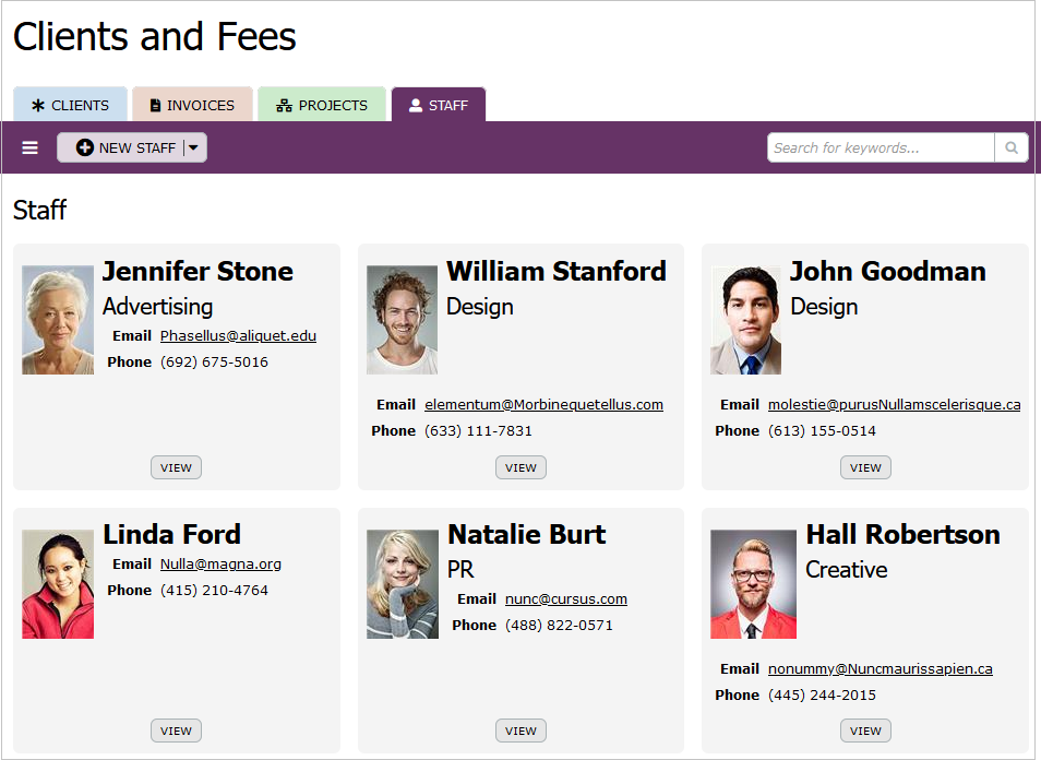 The "Staff" table stores information about the company's employees, including their name, a photo, their job type, phone number, email address, address, and other details that might be relevant to their employment.
