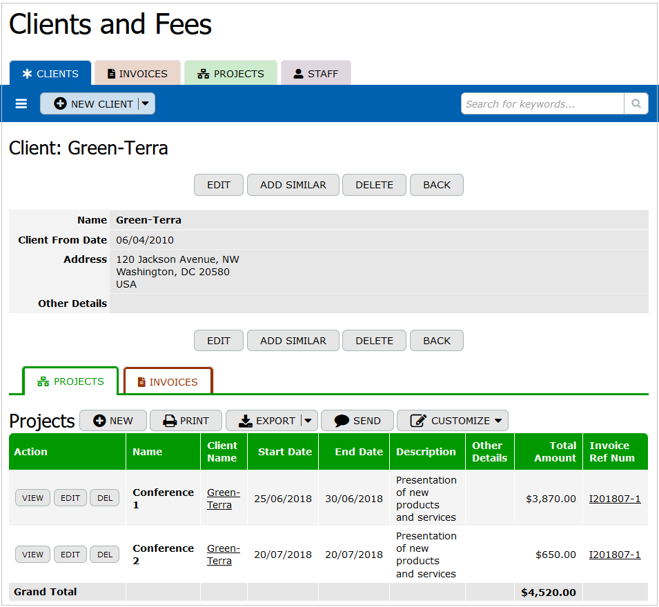 The "Projects" table records information about projects that the company is working on for clients, including the name of the project, the client it is for, the start and end dates, a description of the project, other relevant details, and a reference to the invoice that will be used to bill the client for the work.