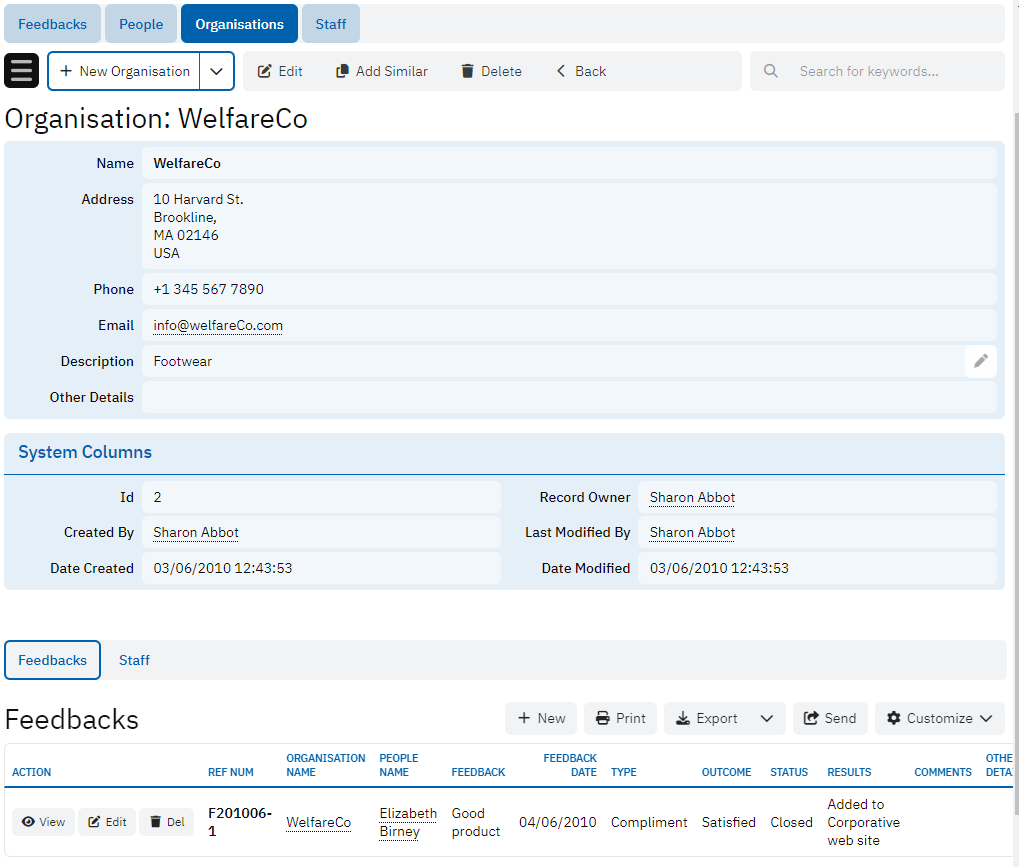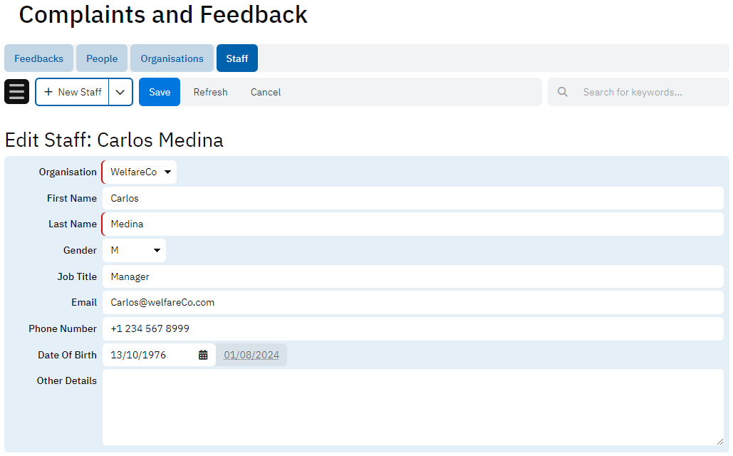 The Staff table holds information about staff members who handle feedback and complaints. It includes their name, associated organization, job title, email, phone number, date of birth, and other details. This table ensures that all staff involved in the feedback process are properly recorded and can be referenced as needed.
