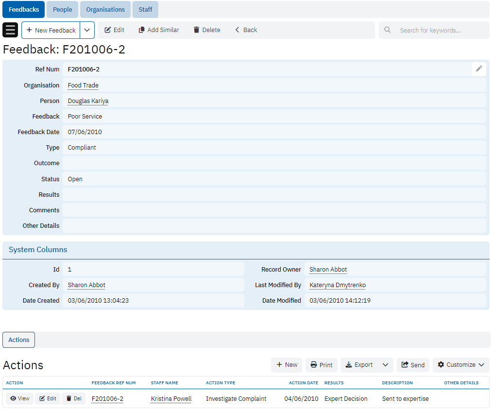 The Actions table records actions taken in response to feedback or complaints. It includes information about the feedback reference number, staff involved, type of action, date, results, description, and other details. This table ensures that each feedback or complaint is appropriately addressed and documented.