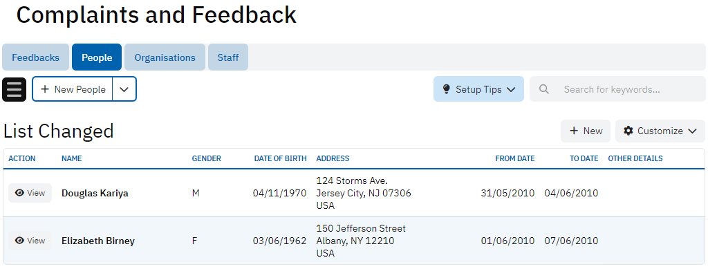 The Peoples table maintains information about individuals related to feedback or complaints. It records their full name, gender, date of birth, address, duration of involvement, and other pertinent details. This table helps keep track of all people involved in the feedback process.