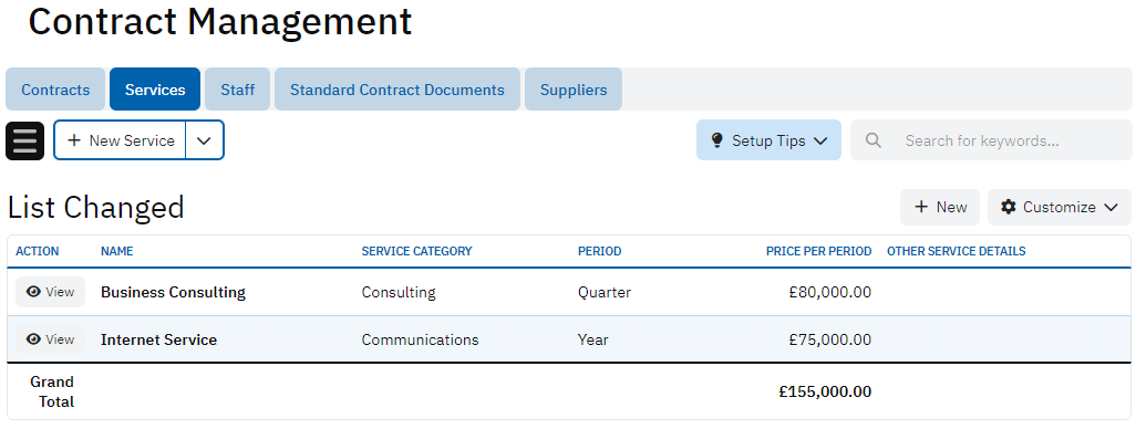 The Contract Services table details the services associated with each contract. It includes the contract registration number, service name, service period, quantity, payment dates and amounts, and other relevant details. This table ensures that all services under each contract are tracked and managed efficiently.