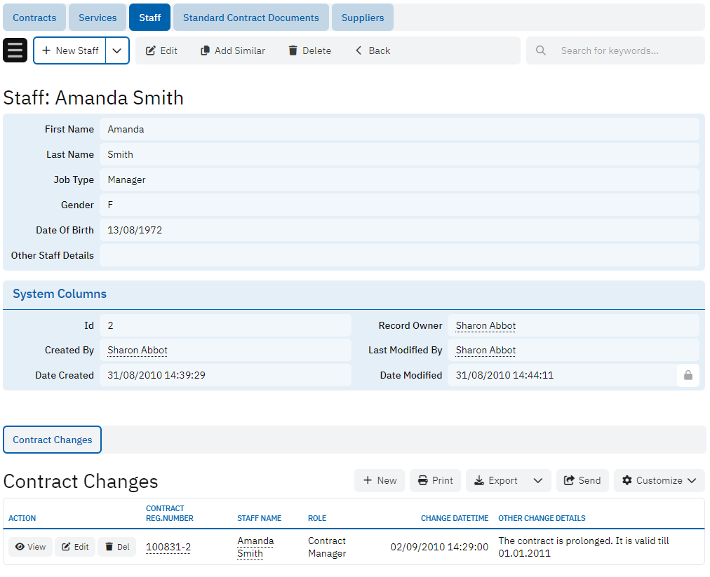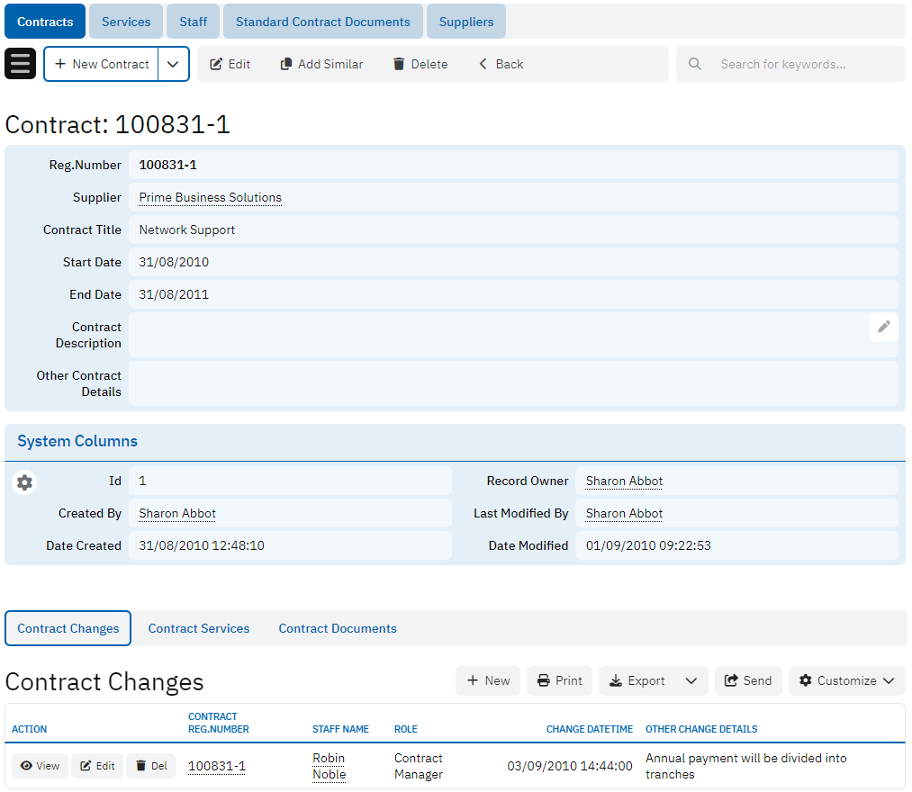 The Contract Changes table records any modifications made to the contracts. It includes the contract registration number, the staff member who authorized the change, their role, the date and time of the change, and other relevant details. This table ensures that all contract changes are well-documented and traceable.