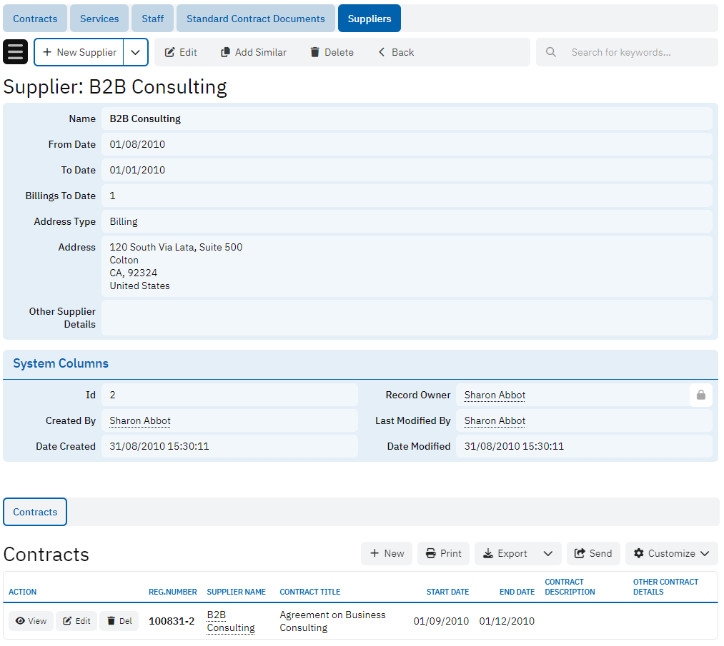 The Contracts table contains detailed information about each contract. It includes the registration number, supplier name, contract title, start and end dates, contract description, and other details. This table serves as the primary repository for all contract information, helping users manage and track contract statuses and details.