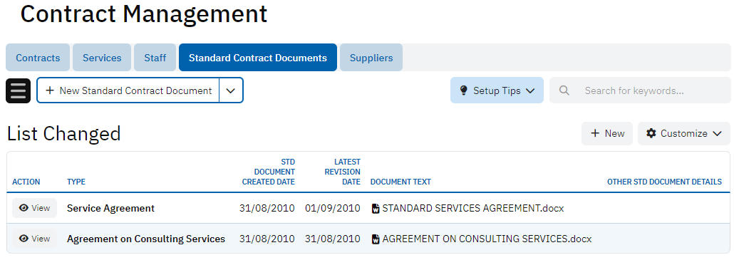 The Standard Contract Documents table holds templates and standard documents used in contracts. It includes the document type, creation and revision dates, document text, and other details. This table ensures that standard documents are easily accessible and up-to-date.