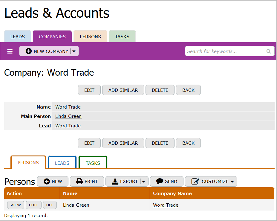 The "Persons" table manages individual contacts associated with leads and companies. It includes columns for ID, record ownership, creator, creation date, modification details, person's name, associated company details, and company name. This table helps in maintaining detailed records of individual contacts, their affiliations with companies, and their roles within the organization.