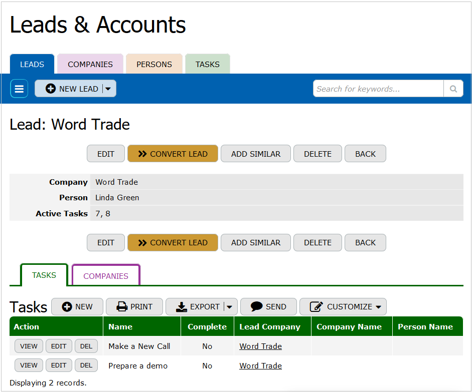 The "Tasks" table tracks tasks associated with leads, companies, and persons within the database. It includes columns for ID, record ownership, creator, creation date, modification details, task name, completion status, and associations with leads, companies, and persons. This table supports task management related to nurturing leads, following up on opportunities, and facilitating the conversion process.