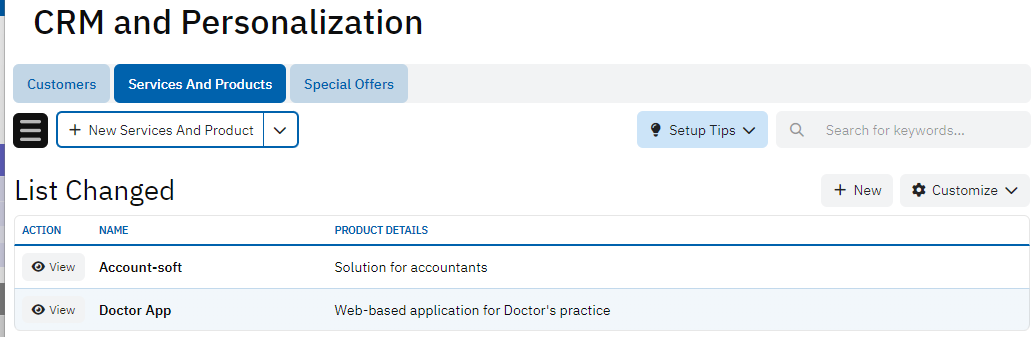 The Services and Products table lists all the services and products offered by the business. It includes detailed information about each product, aiding in inventory management and product tracking.