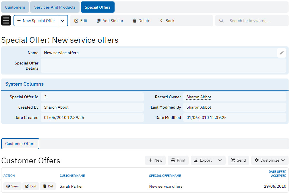 The Special Offers table details the various special offers available, including their names and specific details. This table helps businesses manage their promotional campaigns and track which offers are currently available.