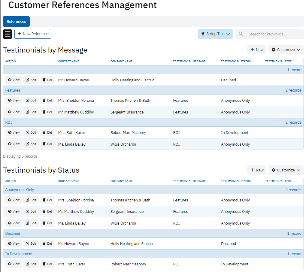 Overall, this database provides a structured and efficient way to manage customer references, enabling businesses to leverage positive customer experiences and endorsements to support their marketing and sales initiatives.
