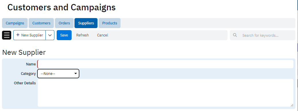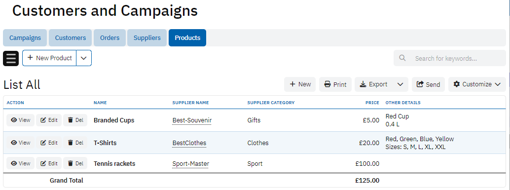 The Products table lists all products available, including their prices and supplier information. This table is key for inventory management and helps in maintaining a catalog of products that can be linked to orders and campaigns.