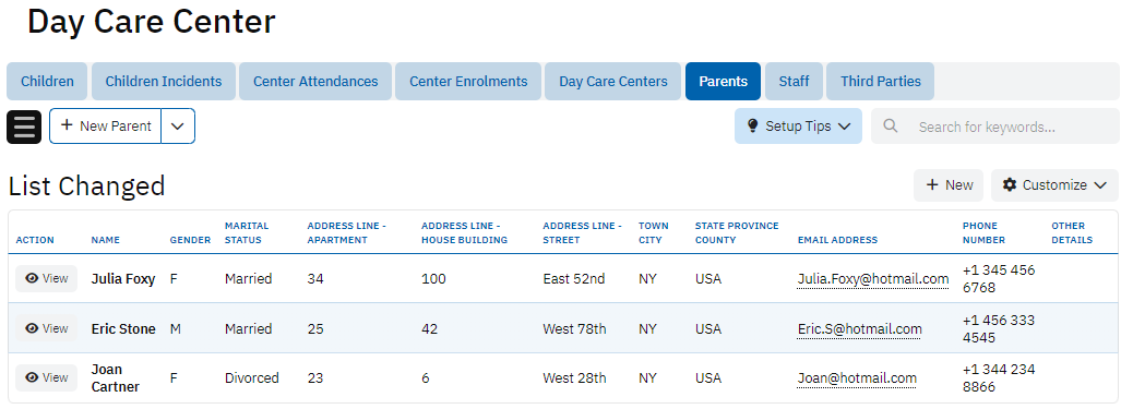 The Parents table holds information about the parents or guardians of the children, including their names, contact details, addresses, and marital status. This table is crucial for maintaining effective communication with parents, ensuring that they are informed about their child's activities and any important updates.