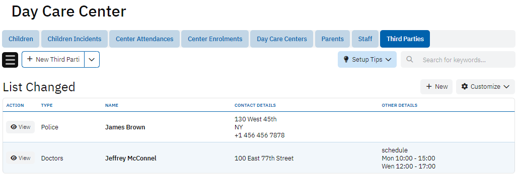 The Third Parties table captures information about external parties involved with the daycare center, such as vendors or contractors, including their contact details and roles. This table is important for managing interactions with external entities, ensuring that all relevant third-party information is documented.