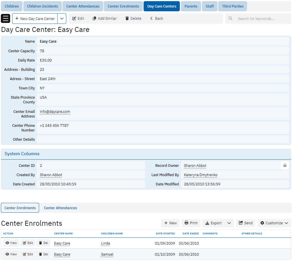 The Center Enrollments table maintains information about children's enrollment at the center, including start and end dates and any related comments. This table is important for managing enrollments, understanding enrollment patterns, and planning resource allocation.