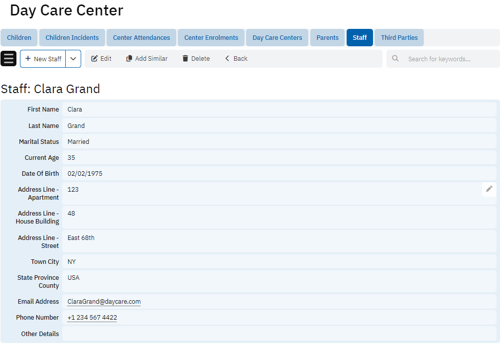 The Staff table records information about the daycare center staff, including their personal details, contact information, and employment status. This table is essential for staff management, ensuring that the center has all necessary details about its employees for effective administration and communication.