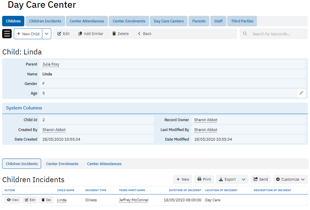 The Children Incidents table records any incidents involving children, including the type of incident, involved third parties, date, time, location, and detailed descriptions. This table is essential for documenting and managing incidents, ensuring child safety, and providing transparency and accountability.