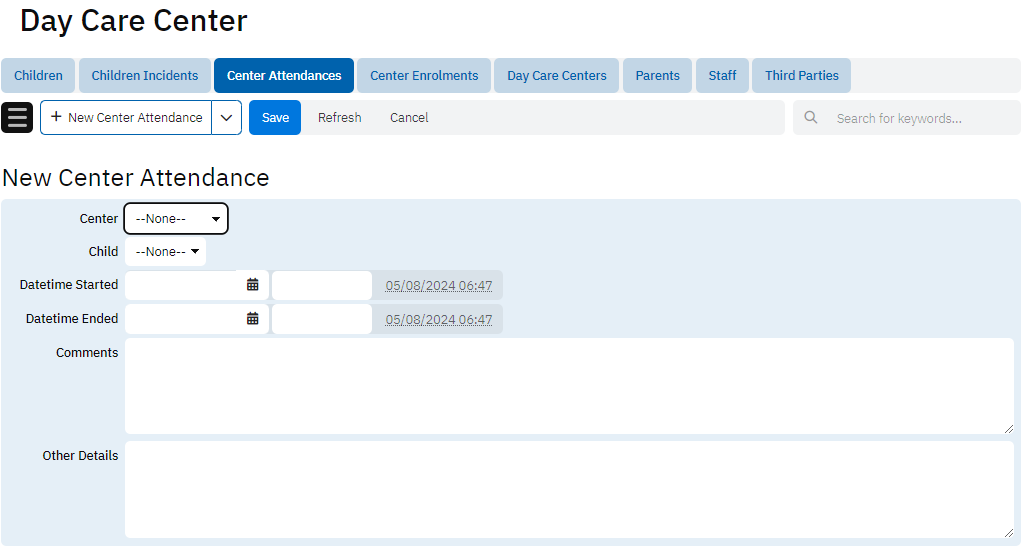 The Center Attendances table tracks the attendance of children at the daycare center, recording the times they start and end each session, along with any comments or additional details. This table supports attendance management, helping to monitor child presence and ensure proper care during their stay.