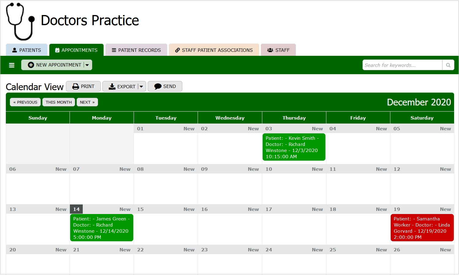 The "Appointments" table tracks appointment details including status code, start and end date/time, and any relevant appointment notes. It also includes references to the corresponding patient and staff members.