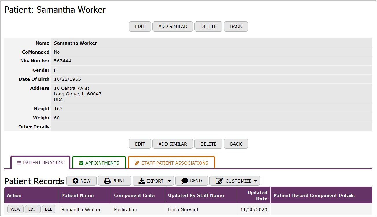 The "Patient Records" table contains specific patient information such as component code, date of update, and details of the patient record component. This table also includes a reference to the staff member who updated the record.