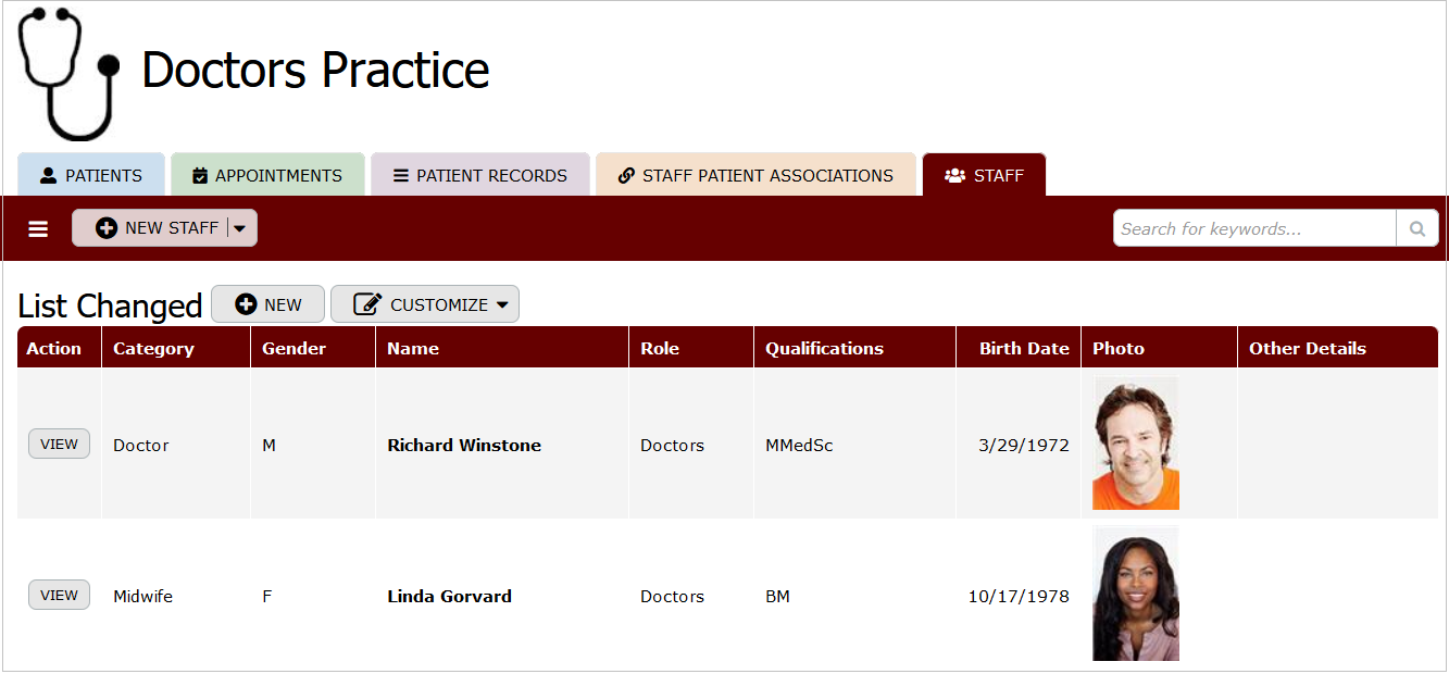 Finally, the "Staff" table stores information about medical staff including category, gender, role, qualifications, date of birth, photo, and other details. It also includes first, middle, and last name fields.