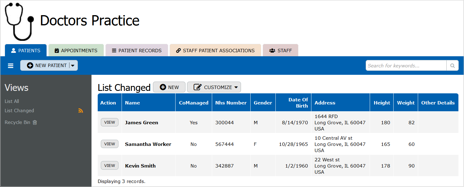 The "Patients" table stores basic patient information such as NHS number, gender, date of birth, address, height, weight, and other details. It also includes a checkbox for indicating if a patient is co-managed with another practitioner.