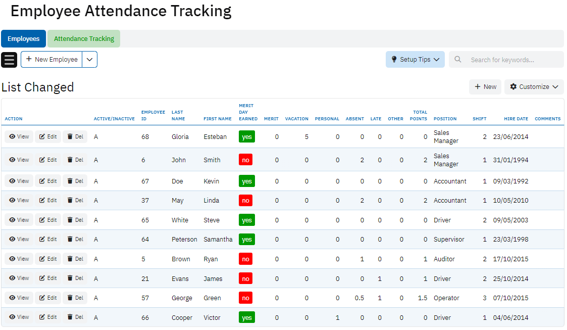 The Employees table contains comprehensive information about each employee, including their employment status (active or inactive), identification details, names, and attendance-related data. This includes metrics such as merit days earned, vacation days, personal leave, absences, lateness, and total attendance points. Additionally, it records the employee's position, shift, hire date, and comments. Summary fields provide aggregated data on vacation, personal leave, absences (with and without a doctor's note), lateness, and merit days. This table is essential for maintaining detailed records of each employee's attendance and leave balances, supporting performance evaluations, and managing workforce planning.