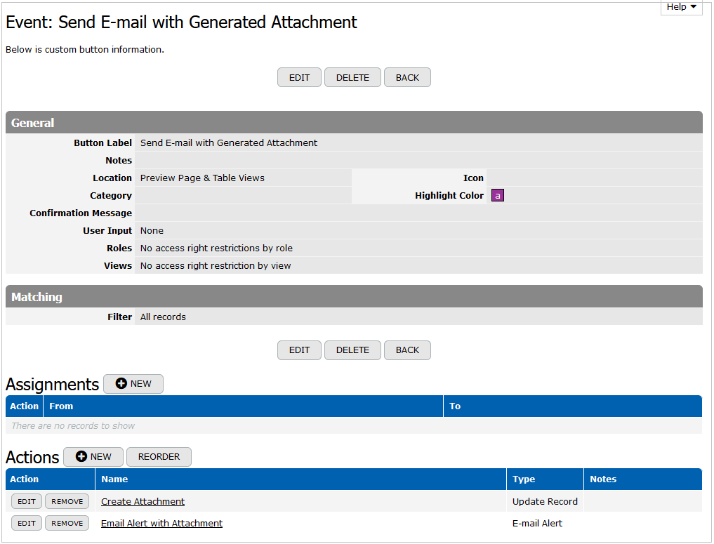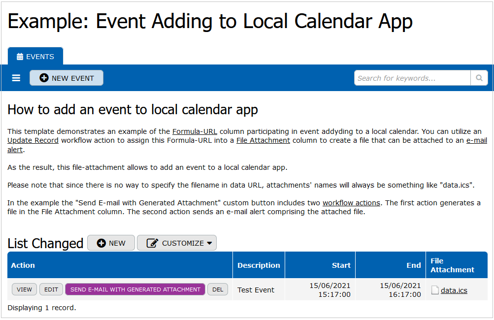 The purpose of the Events table is to provide a centralized repository for managing event details. Users can add new events, update existing ones, and view crucial information such as event duration, associated documents, and any relevant URLs or formulas. This database supports efficient event planning and coordination by offering a structured approach to organizing schedules and ensuring that all stakeholders have access to up-to-date event information. It enhances productivity by facilitating seamless integration with local calendar systems, thereby enabling timely reminders and effective scheduling management.
