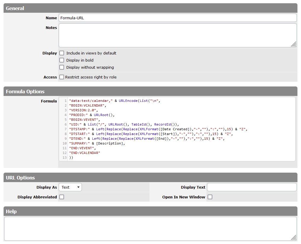 The "Events" table is the core component of the database, housing detailed information about each scheduled event. Key columns include a description of the event, start and end times, any associated file attachments, URLs for additional information or formulas, and standard fields for ownership and modification details. This table allows users to store comprehensive data about events, ensuring that all relevant information is easily accessible and synchronized with local calendar applications.