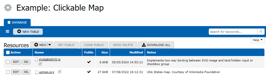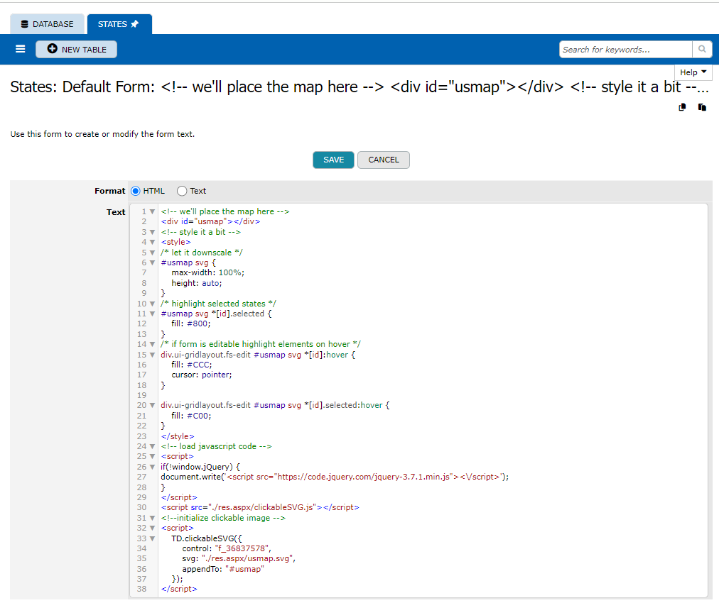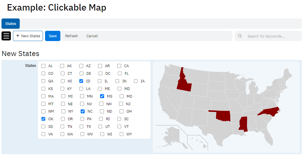 In this example, you can update the checkboxes by clicking on the respective state on the map.