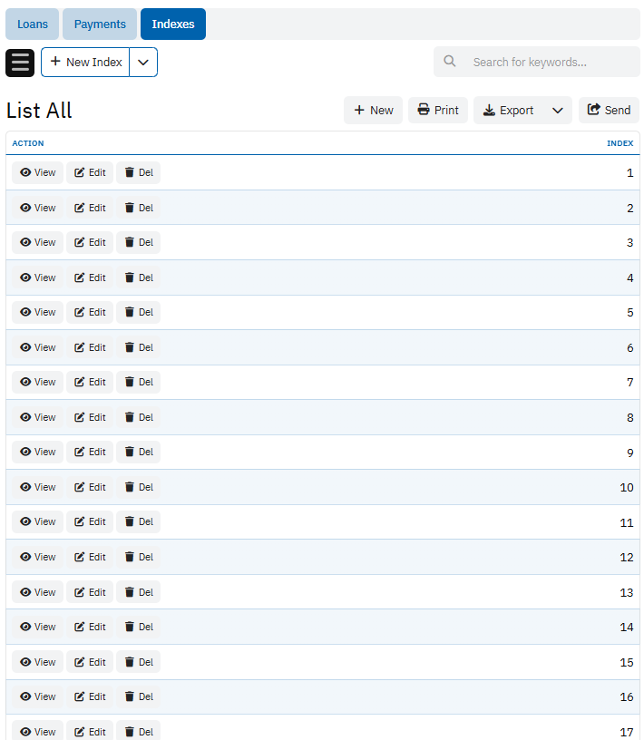 The Indexes table appears to maintain a list of sequential or reference indices that can be used to generate or validate the order of payments. Each record includes standard metadata and a numeric or labeled “Index” value. This table likely supports the automated generation of payment records by providing a reference list for payment intervals (e.g., monthly indices), ensuring accurate scheduling and alignment with loan terms.