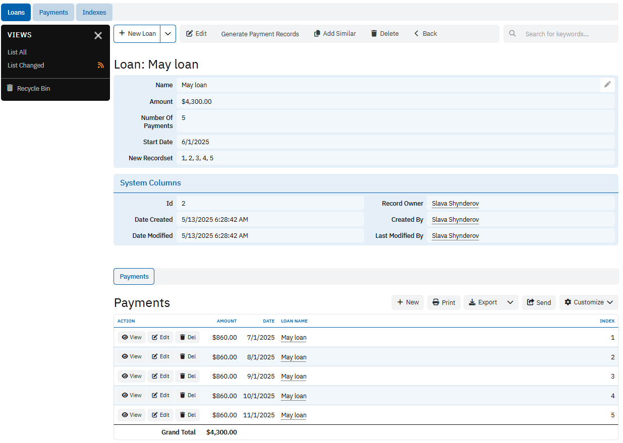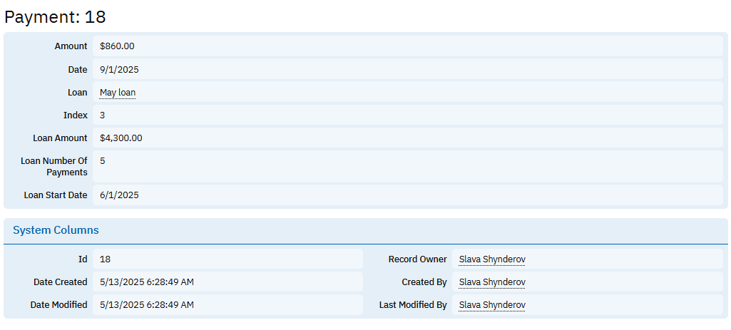 The Loans table holds core information about each loan issued. This includes the loan’s unique identifier, the person responsible for the record, creation and modification details, the loan’s name, total loan amount, number of scheduled payments, and the start date of the loan. It may also include a field named “New Recordset,” which could serve as a flag or reference for generating associated payment records. This table acts as the foundation of the system, from which payment schedules are derived.